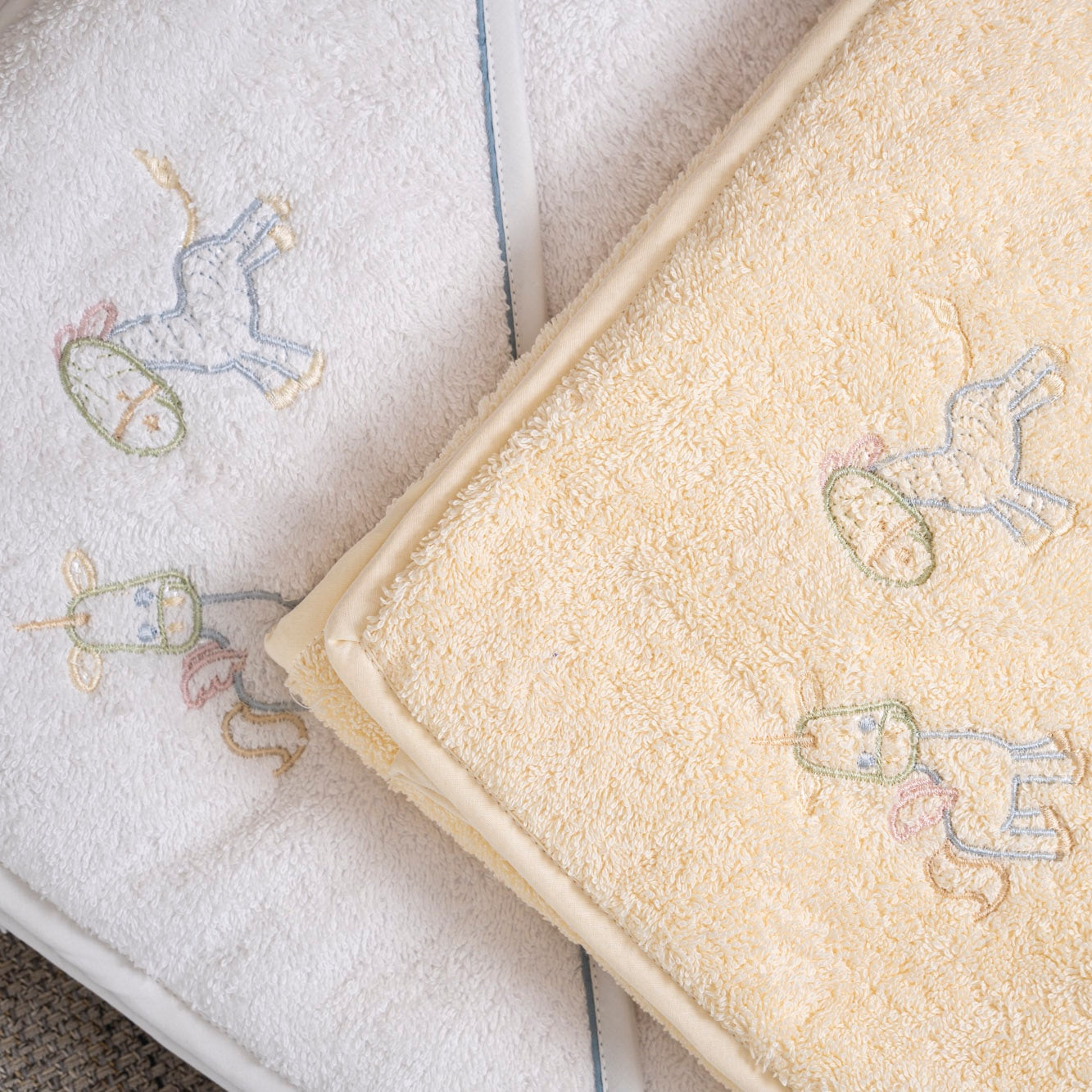 Soft and cuddly, this baby swaddle towel set will delight both your little one and you. Made with 100% cotton for superior absorbency, its adorable baby animal design will make your little one feel snug and secure. Perfect for bath time.