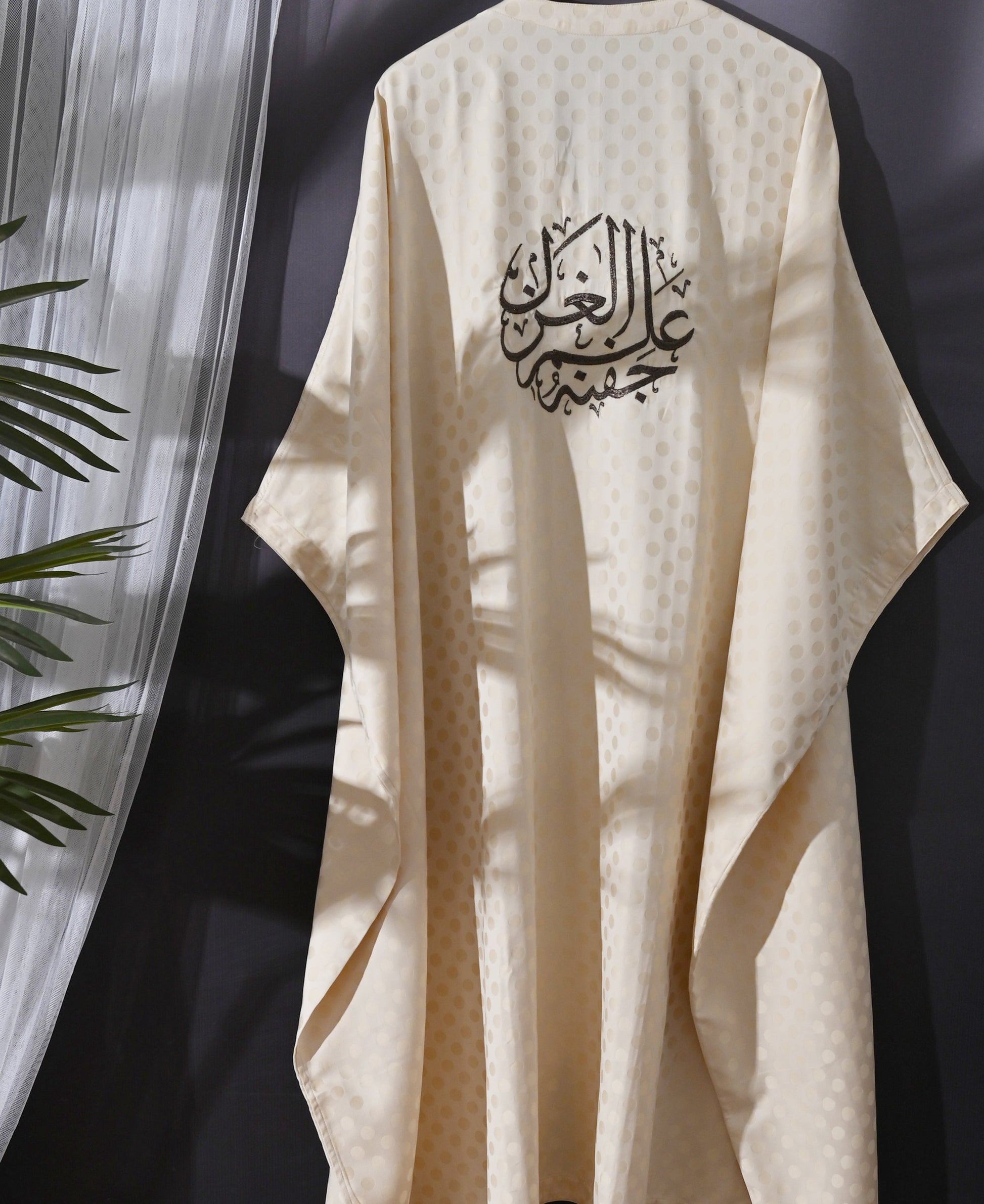 Experience the beauty of calligraphy with our Kaftan! Made with 100% cotton, this kaftan features a traditional calligraphy design. Stay comfortable and stylish with this unique garment.
