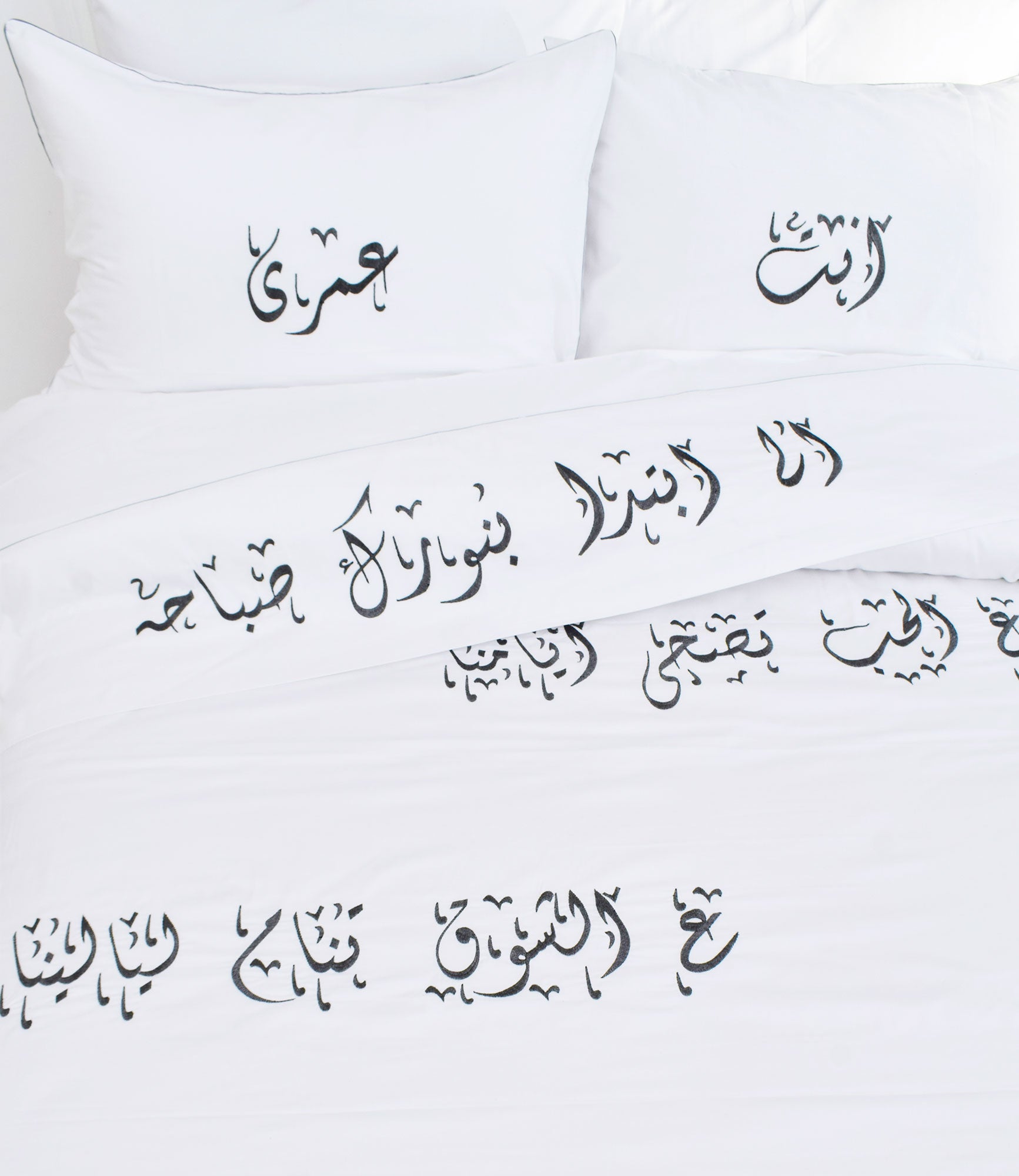 Feel inspired with our luxurious Calligraphy Sheet set, crafted with 100% fine Egyptian Giza Cotton and 600TC Satin. The beautiful lyrics serve as a tribute to Om Kolthoum, creating a wonderful atmosphere as you drift off to sleep. Quality bedding for truly exceptional nights!