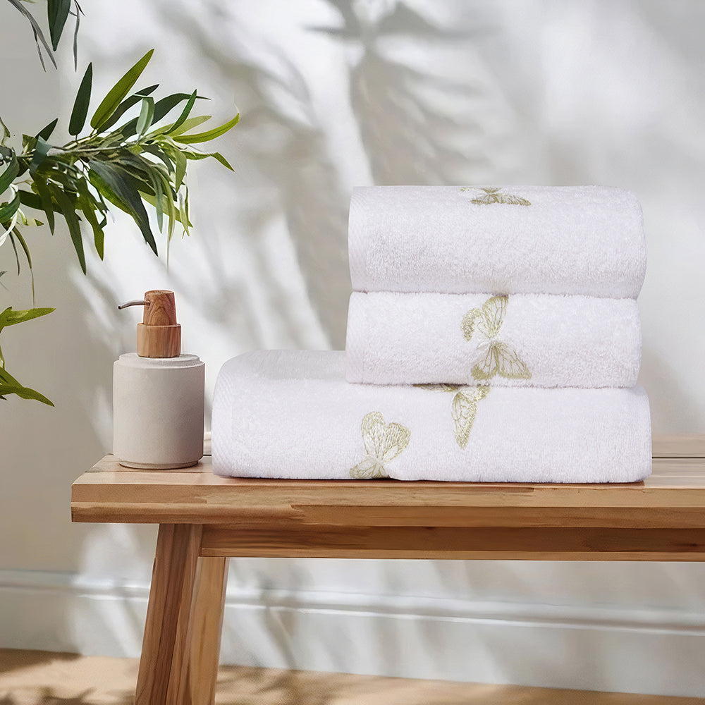 Wrap yourself in luxury with Farashat's exquisite towel set! Made with 100% cotton, each towel in this sumptuous set features beautiful golden butterfly embroidery. Soft yet absorbent, these towels will bring an air of sophistication to your home.