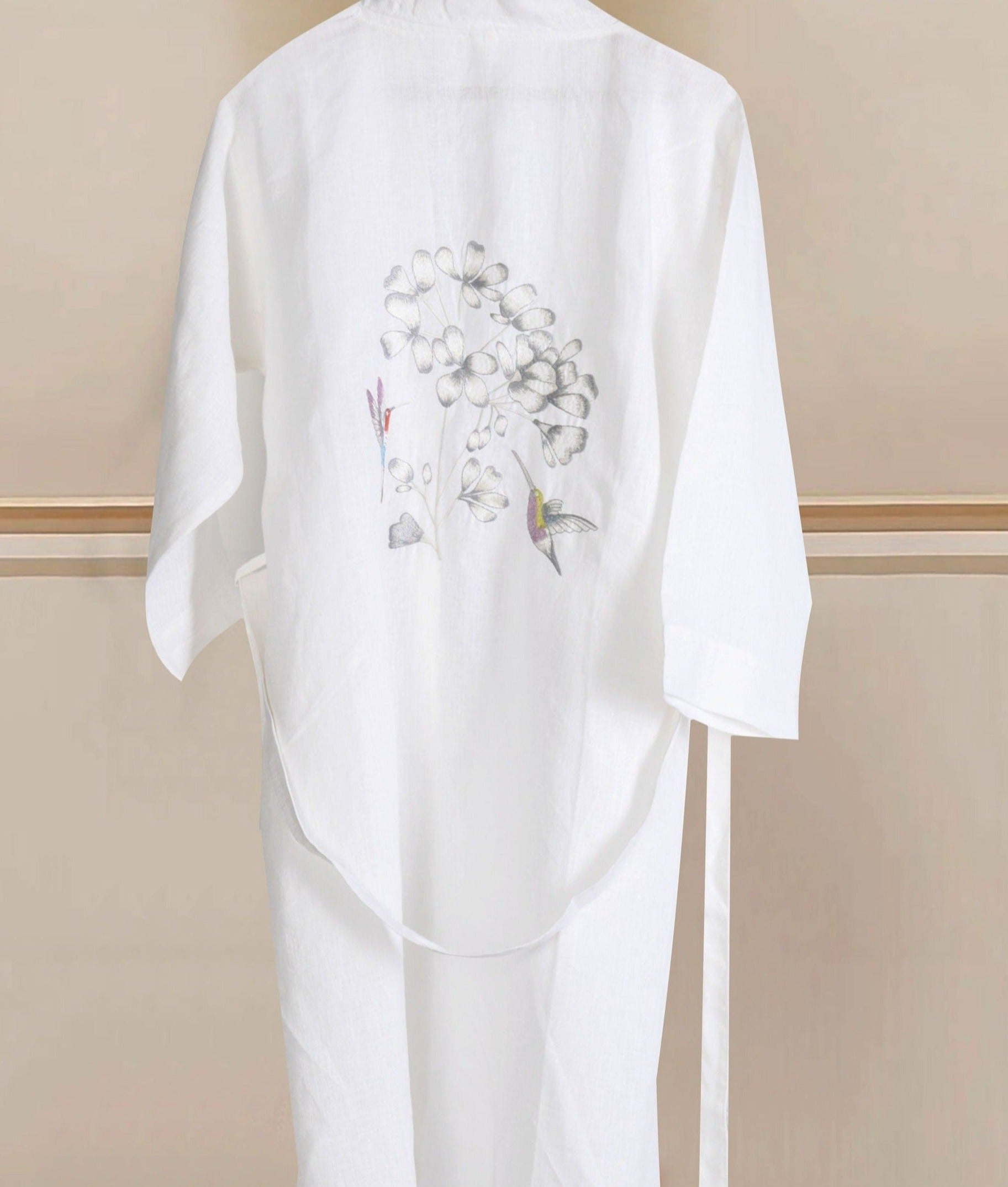 Relax in style with Paradise's Robe. This exquisite lounge wear is crafted from soft linen with an intricate embroidery that will take your breath away. Enjoy the feel of the fabric and the beauty of the design--a perfect choice for lazy days or special nights in!
