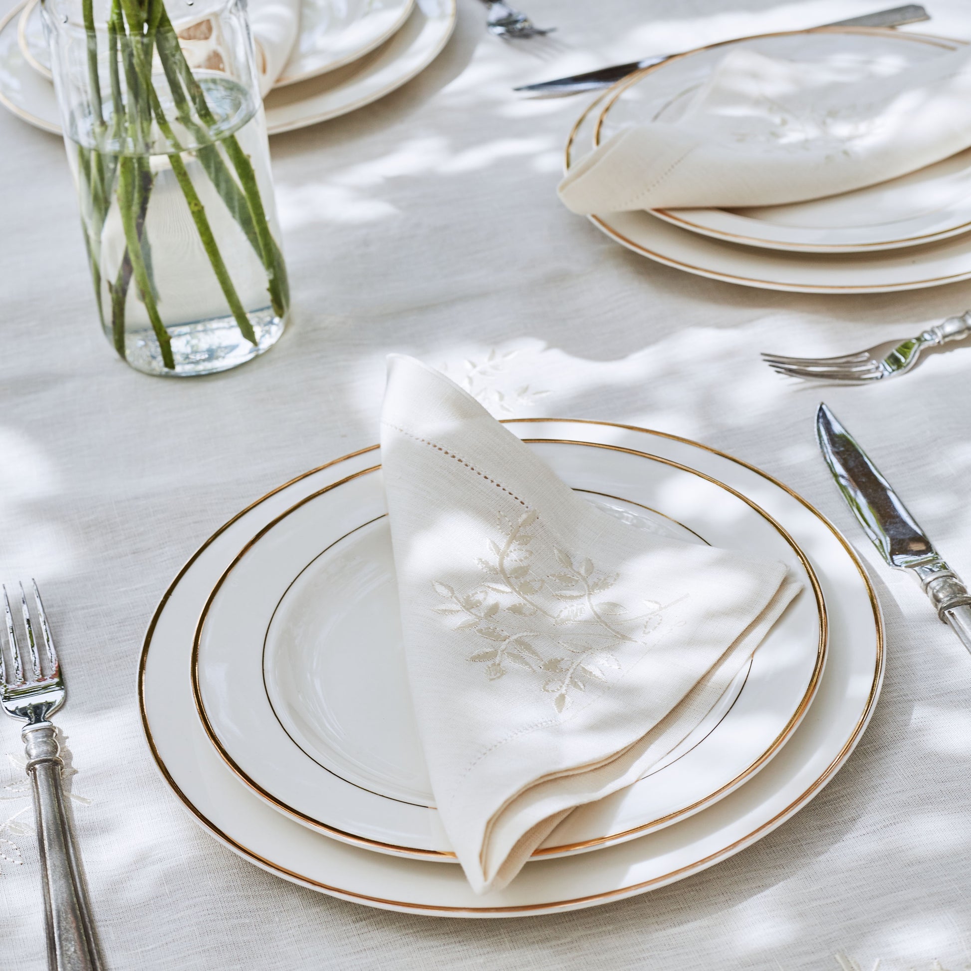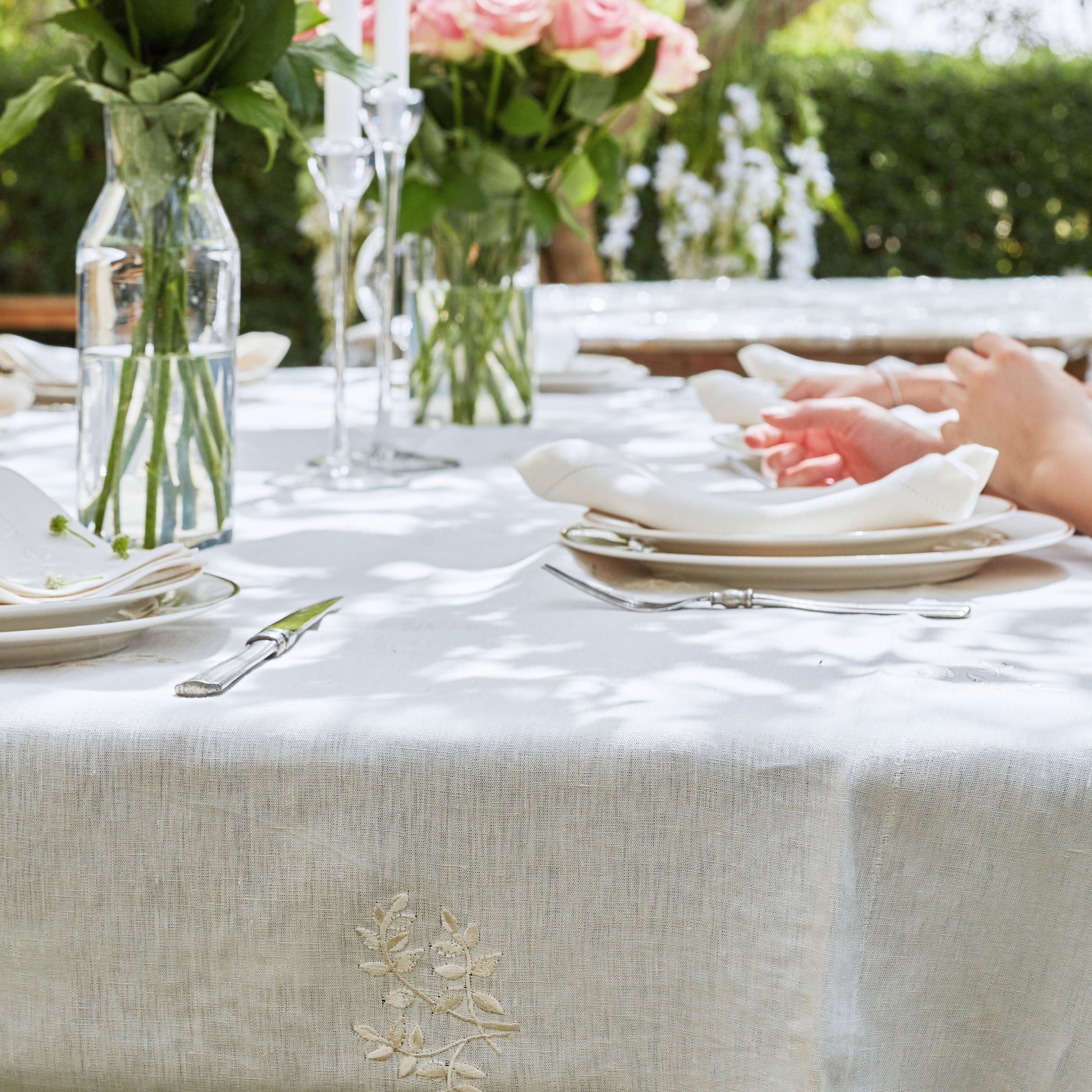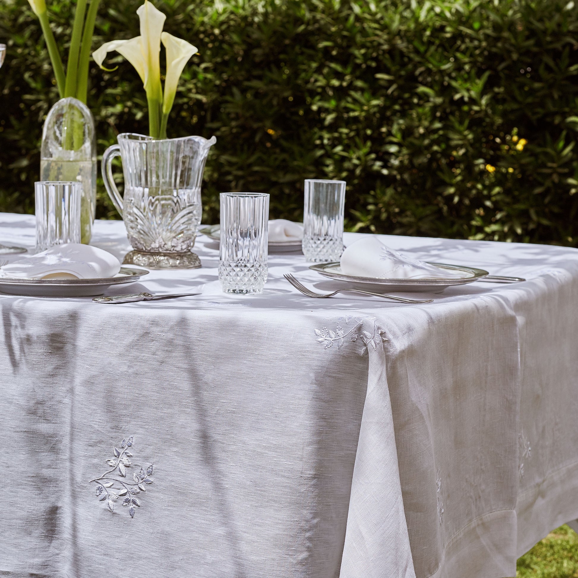 Bring nature indoors with this stunning linen tablecloth. Embroidered with subtle leaves, the fabric adds a touch of elegance to any dining experience. It can brighten up any room as it catches the light, creating an ambient atmosphere.